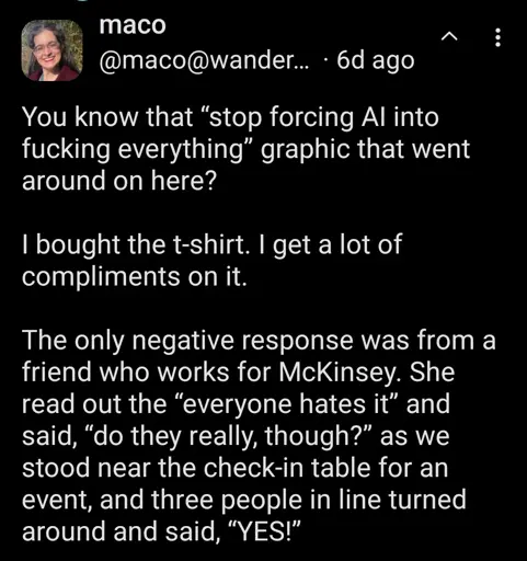 arrow-up1232arrow-down1imageeveryone hates AIplus-squarelemmy.blahaj.zonenot_IO@lemmy.blahaj.zone to Microblog Memes@lemmy.worldEnglish · 4 hours agomessage-square28linkfedilink