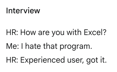 Year 8: New company. They ask if you know Excel. You just start cackling with a addictive gleam in your eye as tears start streaming down your face.