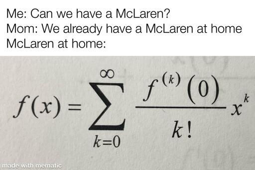 The picture shows a Taylor Series, evaluated at the point 0. When a Taylor Series is evaluated at 0, we call this a Maclaurin Series. Maclaurin sounds kinda like McLaren.
