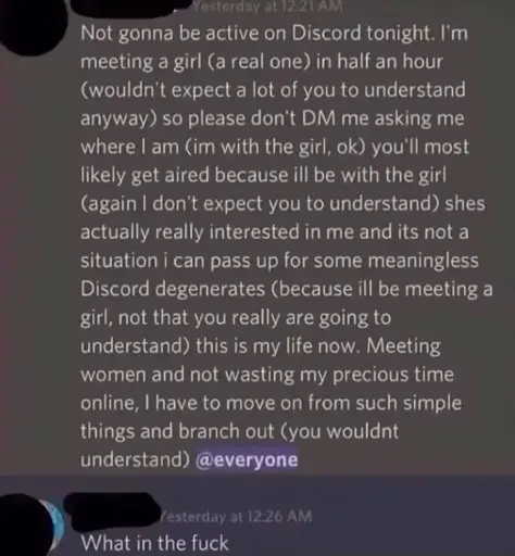 Not gonna be active on Discord tonight. I’m meeting a girl (a real one) in half an hour (wouldn’t expect a lot of you to understand anyway) so please don’t DM me asking me where l am (im with the girl, ok) you’ll most likely get aired because ill be with the girl (again l don’t expect you to understand) shes actually really interested in me and its not a situation i can pass up for some meaningless Discord degenerates (because ill be meeting a girl, not that you really are going to understand) this is my life now. Meeting women and not wasting my precious time online, l have to move on from such simple things and branch out (you wouldnt understand) @everyone
