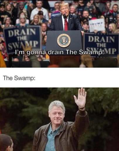 [alt text: a text-and-image post. The first image is a photo of Donald Trump from his 2016 campaign, where he is saying, “I’m gonna drain The Swamp!”. Below this photo is a photo of Bill Clinton, which is labeled “The Swamp”.]