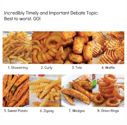 Posting such a controversial question and putting in onion rings on this list is bordering on rage bait