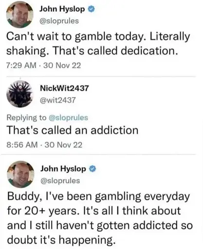 minus-squareNegativeInf@lemmy.worldlinkfedilinkarrow-up2·2 years agoI can quit any time I like. I won’t. But I could!