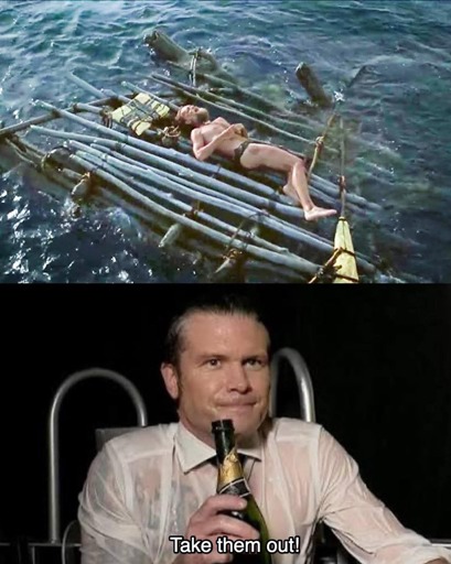 Some kind of Hegseth, US warcrime, double tap boat bombing joke