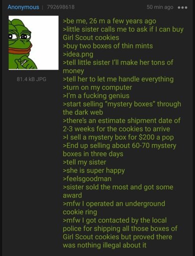 If I was buying mystery boxes of mystery shit on the deep web and ended up with a box of girl scout cookies I wouldn’t even be mad.