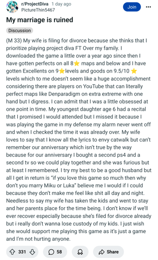 (33) My wife is filing for divorce because she thinks that I prioritize playing project diva FT Over my family. I downloaded the game a little over a year ago since then I have gotten perfects on all 8⭐️ maps and below and I have gotten Excellents on 9⭐️levels and goods on 9.5/10 ⭐️ levels which to me doesn’t seem like a huge accomplishment considering there are players on YouTube that can literally perfect maps like Denparadigm on extra extreme with one hand but I digress. I can admit that I was a little obsessed at one point in time. My youngest daughter age 6 had a recital that I promised I would attended but I missed it because I was playing the game in my defense my alarm never went off and when I checked the time it was already over. My wife loves to say that I know all the lyrics to envy catwalk but can’t remember our anniversary which isn’t true by the way because for our anniversary I bought a second ps4 and a second tv so we could play together and she was furious but at least I remembered. I try my best to be a good husband but all I get in return is “if you love this game so much then why don’t you marry Miku or Luka” believe me I would if I could because they don’t make me feel like shit all day and night. Needless to say my wife has taken the kids and went to stay and her parents place for the time being. I don’t know if we’ll ever recover especially because she’s filed for divorce already but i really don’t wanna lose custody of my kids. I just wish she would support me playing this game as it’s just a game and I’m not hurting anyone.