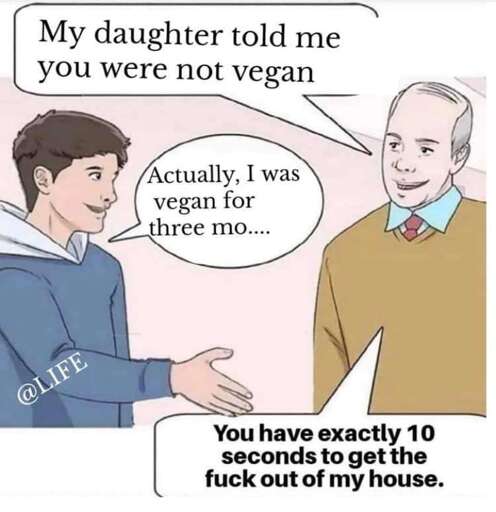 It’s a huge red flag if someone saw how fucked up animal agriculture is and understood why animal exploitation is wrong, stopped supporting it, and then went back to supporting it. So the logic makes sense, that’s something that’s actually worth not wanting someone to date your child for, and it’s funny cause it’s not the stereotype of “parent vetoing childs partner” at all