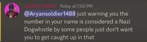 Gee, I wonder if Aryansoldier1488 knows if 1488 is a dog whistle for Nazis? I’d hate for Aryansoldier to get caught up in this. It was probably a random number.