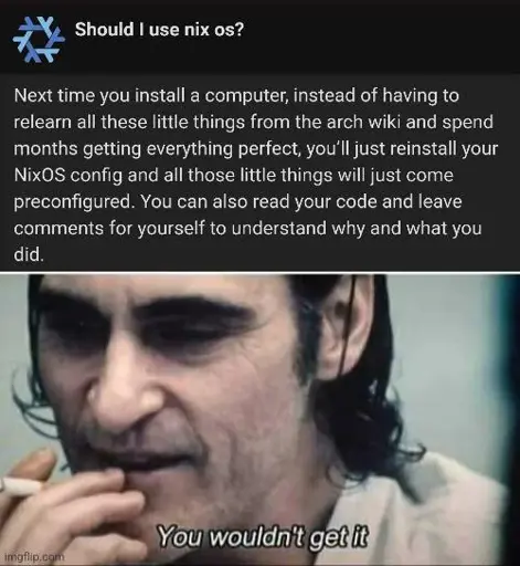 nix being 20 years old and still lacking decent documentation on the language it’s what hurts me the most, because the people who do know it works so some amazing things with it