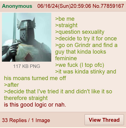 PugJesus@lemmy.world to Greentext@sh.itjust.worksEnglish · 7 months agoSounds logical to melemmy.worldimagemessage-square7linkfedilinkarrow-up10arrow-down10
