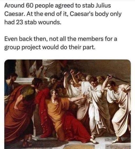 minus-squareGreenShimada@lemmy.worldlinkfedilinkarrow-up23·2 months agoThe symbolism of 60 senators and 60 stab wounds. But, in practicality, by #23, a full freakout was probably going on, so #24 was probably like “Oh, hey, can I just get in here real quick and just… ok, fine! Never mind.”