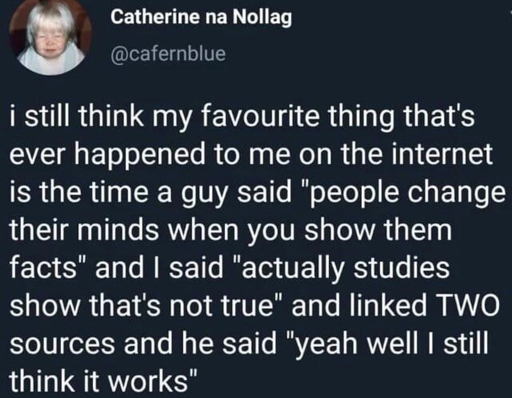 This is why, rather than slapping people in the face with a mountain of research, I try to ask them questions that lead them to the conclusion I want them to reach. Oh we discuss along the way, but you get a lot less of the black and white thinking bold statements that someone entrenched in their beliefs tends to make