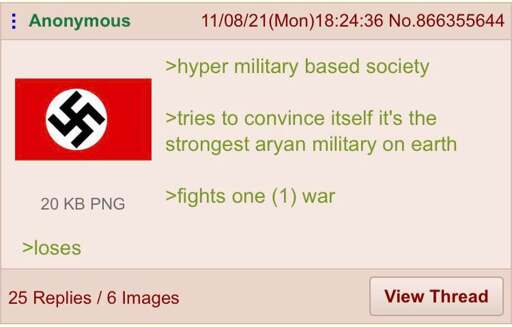 To be fair it was the strongest aryan army at the time. Unfortunately for them, the other armies weren’t so concerned about everyone looking the same and had the advantage perspectives from many people from many walks of life gives to find novel ways to rain death on their enemies.