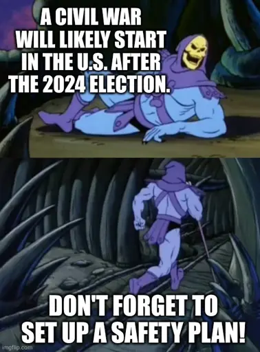 pinkdrunkenelephants@lemmy.cafe to Memes@lemmy.mlEnglish · 2 years agoSkeletor wants you to be safe after the electionlemmy.cafeimagemessage-square2linkfedilinkarrow-up10arrow-down10