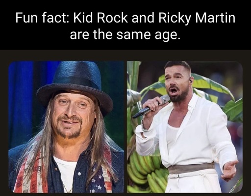 arrow-up1668arrow-down1imageRicky Martin is aging like wine, Kid Rock is aging like milk left out in the sun in Arizona.lemmy.worldWanderWisley@lemmy.world to memes@lemmy.world · 1 day agomessage-square90linkfedilink