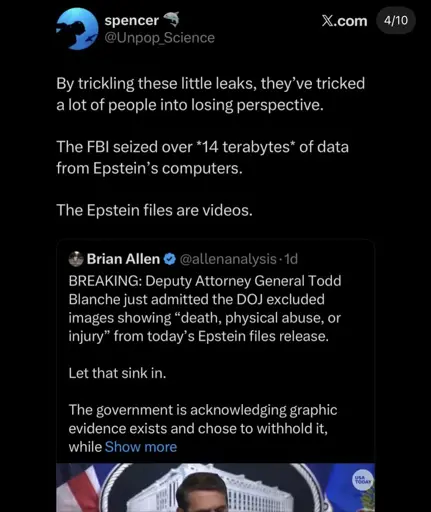 arrow-up1852arrow-down1imageThe DOJ excluded images showing "death, physical abuse or injury" from Epstein files release.sh.itjust.worksspaghettiwestern@sh.itjust.works to Political Memes@lemmy.world · 2 days agomessage-square61linkfedilink
