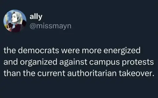ID: ally @missmayn posted: “the democrats were more energized and organized against campus protests than the current authoritarian takeover.”