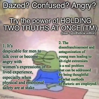 I am calling to be kind and understanding to young men (often ages 10-20) who are very manipulable and succeptible to the massive anti feminist propaganda machine. Hope this clarifies that very important distinction. :)