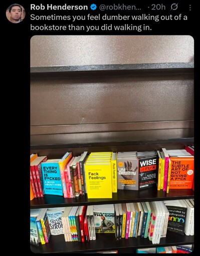 All that being said, the subtle art of not giving a fuck introduced me to some ideas, conceptually, about humankind and our nature and the way we behave in our lives that blew my mind and changed the way I thought of the world and the behaviors of people around me. Very keen observations and assertions in there that had never really occurred to me, functionally. Maybe, it came to me at a time when I really needed to hear something from it? Regardless, it does hold a unique place for me in my mind, and affects my ideas about being a human being and I very much value that growth. Can’t necessarily speak to the prose positively or negatively, but I’m thinking generally self-help books aren’t necessarily masterworks of literature.