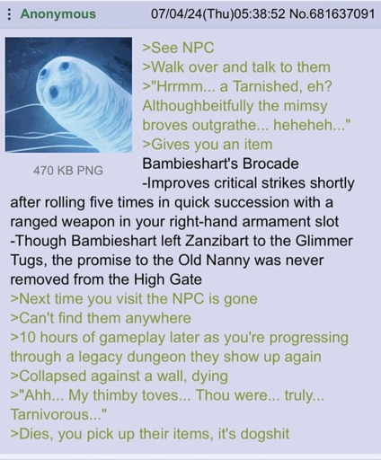 The problem is that you talked to Bambieshart before encountering Lotherad’s Hound. If you’d waited until after that fight, he would have given you Bambieshart’s Shattered Urn, which you could give to Herrigold in the Dying Swamp for Kneivel’s Sisters, the best weapon in the game