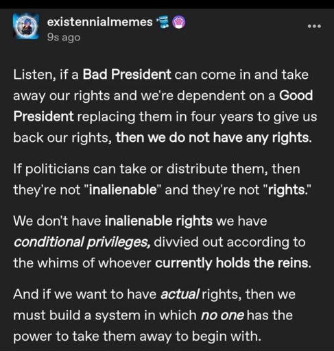 I mean, I don’t see how that is even theoretically possible though? You could set up a system of laws such that nobody has the legal authority to either revoke people’s rights or to change the law to allow them that authority, but at the end of the day, laws are just words on paper (or whatever other medium). If someone can physically overpower the state and any other group that attemps resistance, that person can just rip up all those laws and establish new systems, and since that can theoretically be achieved by just getting enough people to follow and listen to you, and communication is one of those rights people generally seek to protect anyway, you can’t entirely eliminate the risk that some demagogue will find a way to whip up a cult following big enough.