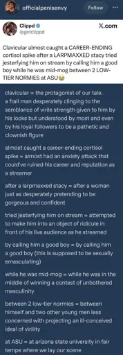 Also, for anyone wanting an indirect education on this language, go listen to the Behind the Bastards podcast on Clavicular, it does a great job explaining the infiltration of incel language (which is mostly what the meme is) into the lexicon and talking about Clavicular.