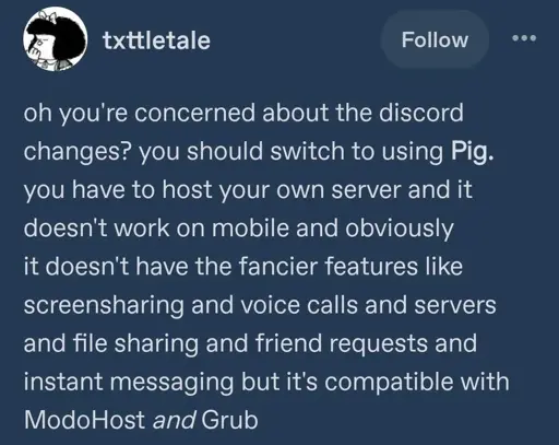 Screen sharing support has been added to Stoat but it’s disabled on the main server so you have to self host to use it, but self hosting Stoat is a pain because the main instance is hardcoded into the clients, so you have to edit their source code and recompile them. There are also no notification sounds for some reason.