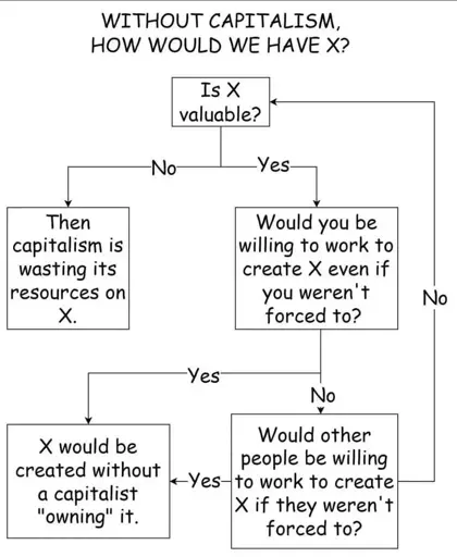 Maybe it should loop back to the “Then capitalism is wasting…” box, since if nobody is willing to create it, is it really valuable enough to exceed creation inertia?