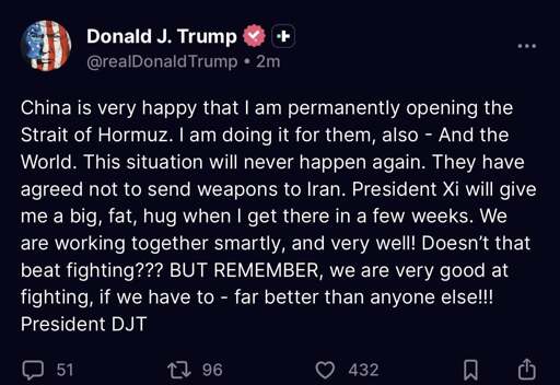 Ai, please write the stupidest shit ever about how I’m going to open the straight of Hormuz after I shut it down for a month with a stupid war. Mention Xi in a rudely polite asshole way. Make it sound like I’m 5 and the straight of Hormuz is really straight and hasn’t sucked me off. Again the guy is straight, not like Bubba.