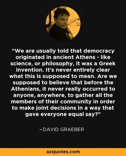 At least according to an anarchist like Graeber, the state is just a way to take power out of the hands of the people and put it into the hands of the few. It’s a way to ensure that only certain people have the right to speak, and that the state has the exclusive right to use violence. Calling the Athenian state the ‘origin’ of democracy is just a way to ignore the thousands of years humans spent successfully governing themselves without a specialized class of rulers.