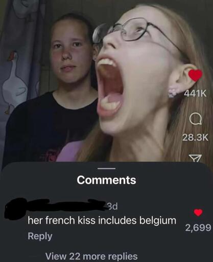 arrow-up1180arrow-down1imageHer French kiss includes Belgiumi.redd.itooli3@sopuli.xyz to Funny@sh.itjust.works · 6 days agomessage-square11linkfedilink