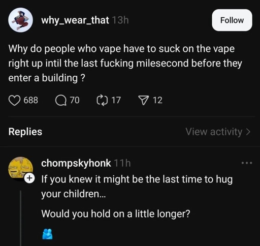 I’m specifically calling out people who downvoted me for saying I don’t like the smell of vapes