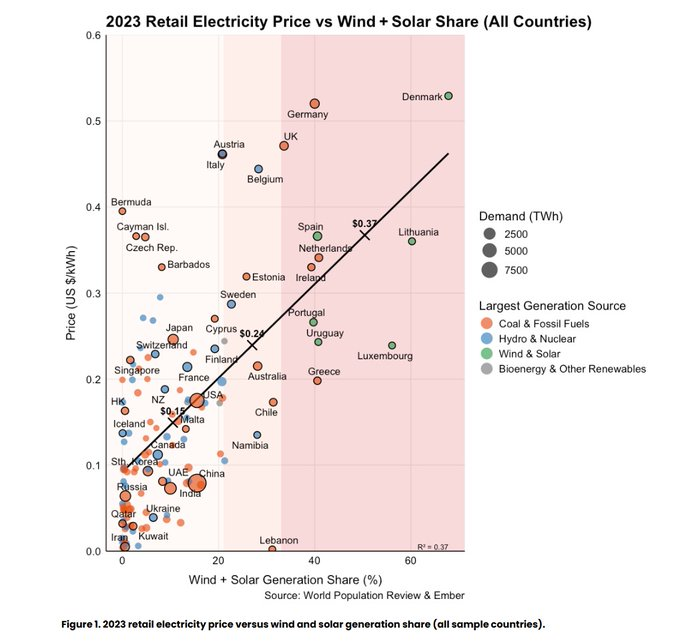 As you can see, as wind + solar generation share goes up, retail electricity prices go up. They never go down. They never even stay the same.