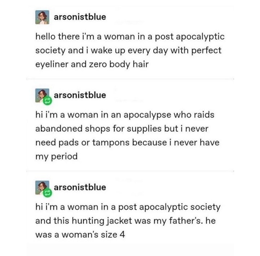 It’s almost like the point of these scenarios is fun escapism and isn’t about perfectly simulating an apocalyptic wasteland down to the most mundane and uninteresting parts.