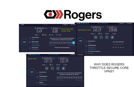 Rogers has no way to distinguish between Proton’s “secure core” VPN and a simpler, more local Proton VPN endpoint. In both cases they see you sending encrypted VPN traffic to Proton - they can’t see where Proton then sends that traffic next (naturally, because it’s a VPN). If Proton’s “secure core” VPN is slow but Proton’s other options are fast then that’s on Proton.