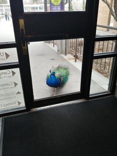 There’s a well known peacock on the University of Victoria campus who made it there from Beacon Hill Park. This photo looks like it’s taken in the Student Union Building there.